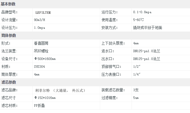 利菲爾特大流量保安過濾器結(jié)構(gòu)為圓柱形殼體,材質(zhì)為304或,316L不銹鋼;配以單支或多支濾芯。