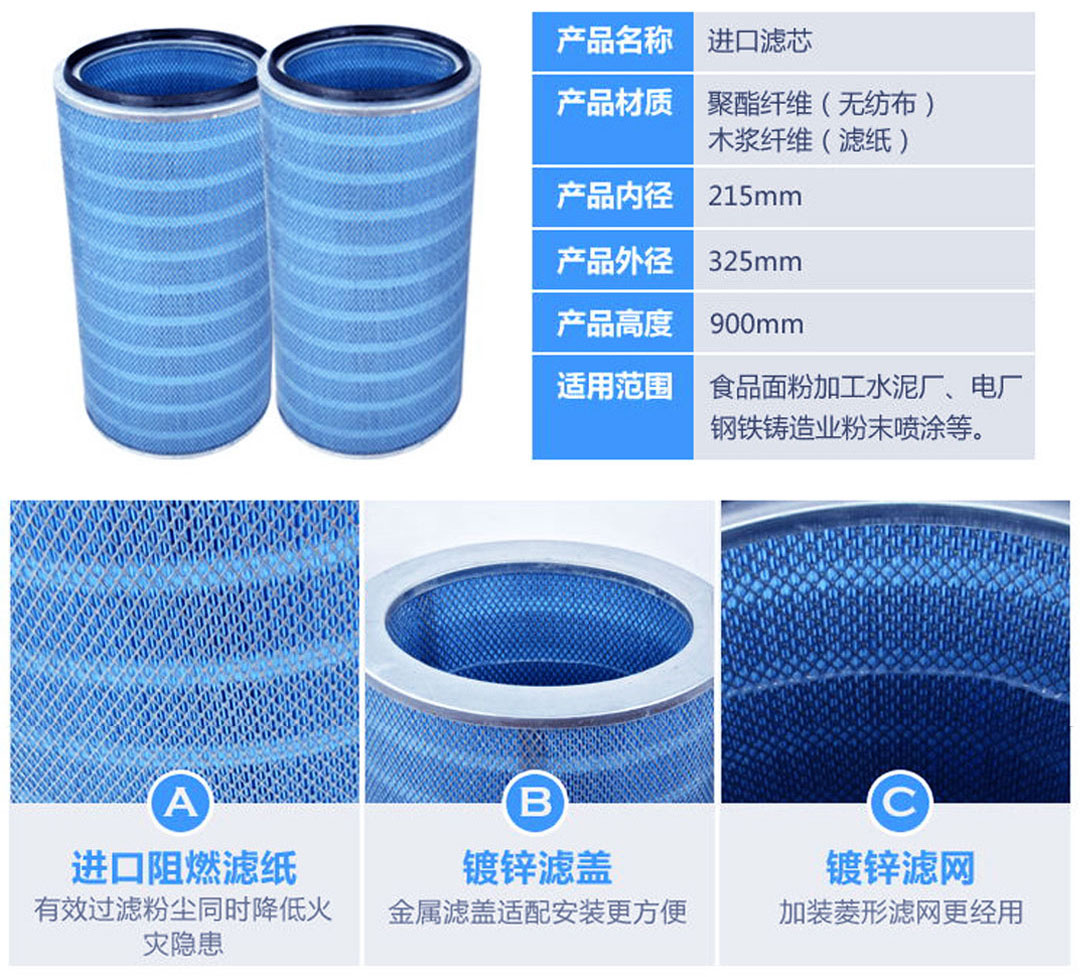 當含塵氣體進入濾筒除塵器灰斗后,由于氣流斷面突然擴大及氣流分布板作用,氣流中一部分粗大顆粒在動和慣性力作用下沉降在灰斗;粒度細、密度小的塵粒進入濾筒室后,通過布朗擴散和篩濾等組合效應,使粉塵沉積在空氣濾筒濾料表面上,凈化后的氣體進入凈氣室由排氣管經(jīng)風機排出