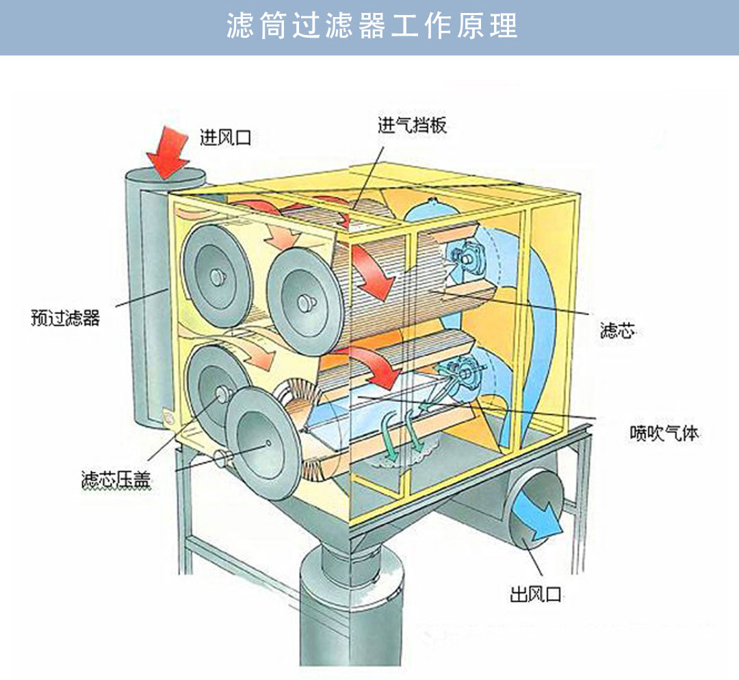 含塵廢氣進入脈沖褶式濾筒除塵器進風(fēng)口后,由于氣流截面突然擴大及氣流分布板的作用,風(fēng)速驟降,氣流中一部分粗大顆粒在風(fēng)動力和慣性力的作用下相互碰撞,自然沉降到底部集灰斗;粒度細(xì)、密度小的塵粒,通過擴散和篩濾等組合效應(yīng),沉積在濾筒濾料的外表面上而被攔截,潔凈的氣體穿透濾料內(nèi)壁,進入潔凈室由排氣管經(jīng)風(fēng)機抽出。過濾元件濾筒的阻力,隨著濾料表面粉塵積累層厚度的增加而增大。噴吹控制方式可以分為壓差控制、時序控制、人工控制。例如壓差控制:當(dāng)阻力達(dá)到某一設(shè)定值時,數(shù)顯壓差儀表激發(fā)信號,脈沖控制儀或PLC控制程序收到反饋信號后,自動判斷數(shù)據(jù),下指令進行連鎖執(zhí)行動作,自動進行啟閉閥門噴吹清灰。此時,瞬間接通脈沖電源,電磁脈沖閥開啟,4公斤以上壓力的壓縮空氣瞬間引入周邊空氣作為二次放大的充足氣源,通過文氏管,一并高壓噴吹打入濾筒,使褶皺的濾筒瞬間膨脹變形鼓起,而產(chǎn)生振動,在高壓脈沖氣流沖刷的作用下,附著在濾筒外表面上的粉塵被一掃而光,掉入除塵器底部收集粉塵的灰斗收塵箱中。清灰完畢后,電磁脈沖閥關(guān)閉,濾料外表面粉塵清除后,阻力變小,濾料獲得再生,再次恢復(fù)攔截粉塵的功能。當(dāng)阻力上升時,再次自動循環(huán)清灰再生工作。