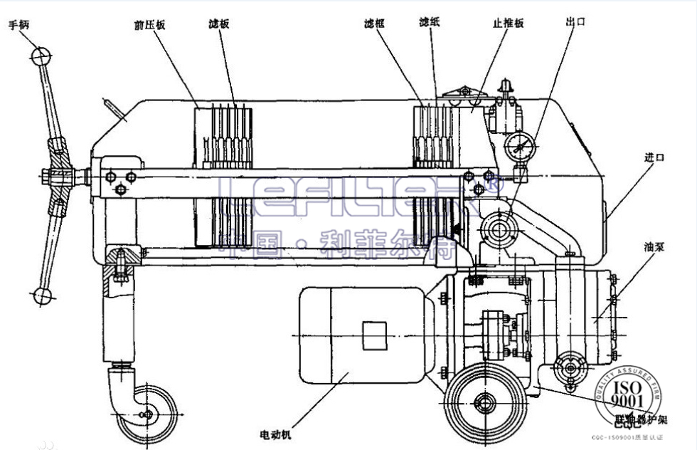 LY-100板框濾油機由過濾床,油泵和粗過濾器等元件組成。濾板和濾框間襯有作為過濾介質的濾紙或濾布,憑借壓緊裝置的壓力將濾板和濾框固定形成一個單獨的過濾室,被壓緊在濾板和濾框之間的濾紙或濾布起過濾作用。根據用戶需要可選特殊材料及配用特種電機也可。當油中水分過多時,應先將油加熱,使水分蒸發(fā)一部份之后再過濾,如油很臟,需經其它處理后再過濾。
