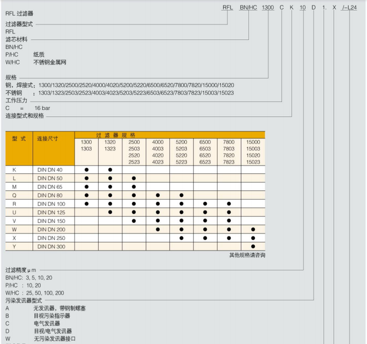 產(chǎn)品簡介:替代替代賀德克RFLBN/HC1300CK10D1.X/-L24產(chǎn)品介紹 RFLBN/HC1300CK10D1.X/-L24主要用于潤滑系統(tǒng)中的精過濾,該過濾器由筒體和支架組成,進(jìn)出油口的兩個(gè)法蘭在筒體的兩側(cè),該過濾器設(shè)有放氣孔,大流量的過濾器上蓋設(shè)有提升裝置,以便在維修時(shí)減輕維修人員的勞動,