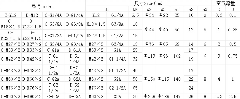 一.產(chǎn)品簡介 C 型空氣濾清器適用于減速器排氣用。它能維持減速器箱體內(nèi)的壓力和大氣壓力平衡,并防止贓物顆粒從外部進入箱體,保持箱體內(nèi)油液的清潔,延長減速器的使用壽命 . 二.技術(shù)參數(shù)及連接尺寸 型號model 尺寸Size(mm) 空氣流量(m3/min) d1 DN d2 d3