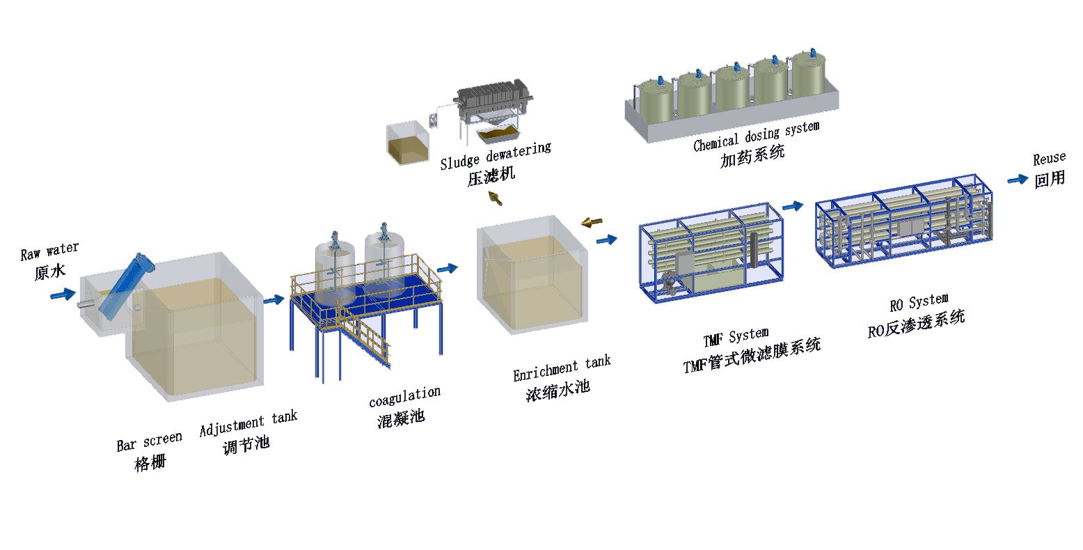 采用我公司自主研發(fā)的工業(yè)流程技術(shù)+進(jìn)口的核心部件,將部分中水經(jīng)過(guò)模塊回流至原水進(jìn)水端,增大原水量,再加上膜組件巧妙地多芯裝多段排列,保證整體的高回收率且不造成膜結(jié)垢污染。