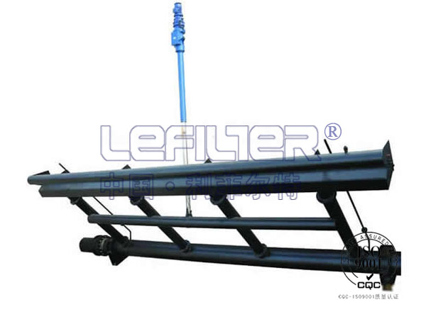 旋轉(zhuǎn)潷水器由潷水裝置、傳動(dòng)裝置、撇渣浮筒裝置及回轉(zhuǎn)支承等組成。驅(qū)動(dòng)機(jī)構(gòu)通過(guò)可伸縮推桿帶動(dòng)潷水裝置及撇渣浮筒裝置繞回轉(zhuǎn)支承旋轉(zhuǎn),從而使?jié)呖谏舷乱苿?dòng),達(dá)到潷出上清液的目的。旋轉(zhuǎn)潷水器可根據(jù)工藝要求設(shè)計(jì)潷水深度。旋轉(zhuǎn)潷水器接到排水指令后快速將潷水堰口由停放位置移動(dòng)到水面以下停止、排水;待清水排完后,旋轉(zhuǎn)潷水器又接到排水指令快速將潷水堰口由停放位置移動(dòng)到水面以下停止,排水;如此反復(fù)。當(dāng)旋轉(zhuǎn)潷水器到達(dá)較低水位后,安放在較低水位的液位開關(guān)發(fā)出返回指令,旋轉(zhuǎn)潷水器快速回升到較初的停放位置,完成一個(gè)工作循環(huán)。